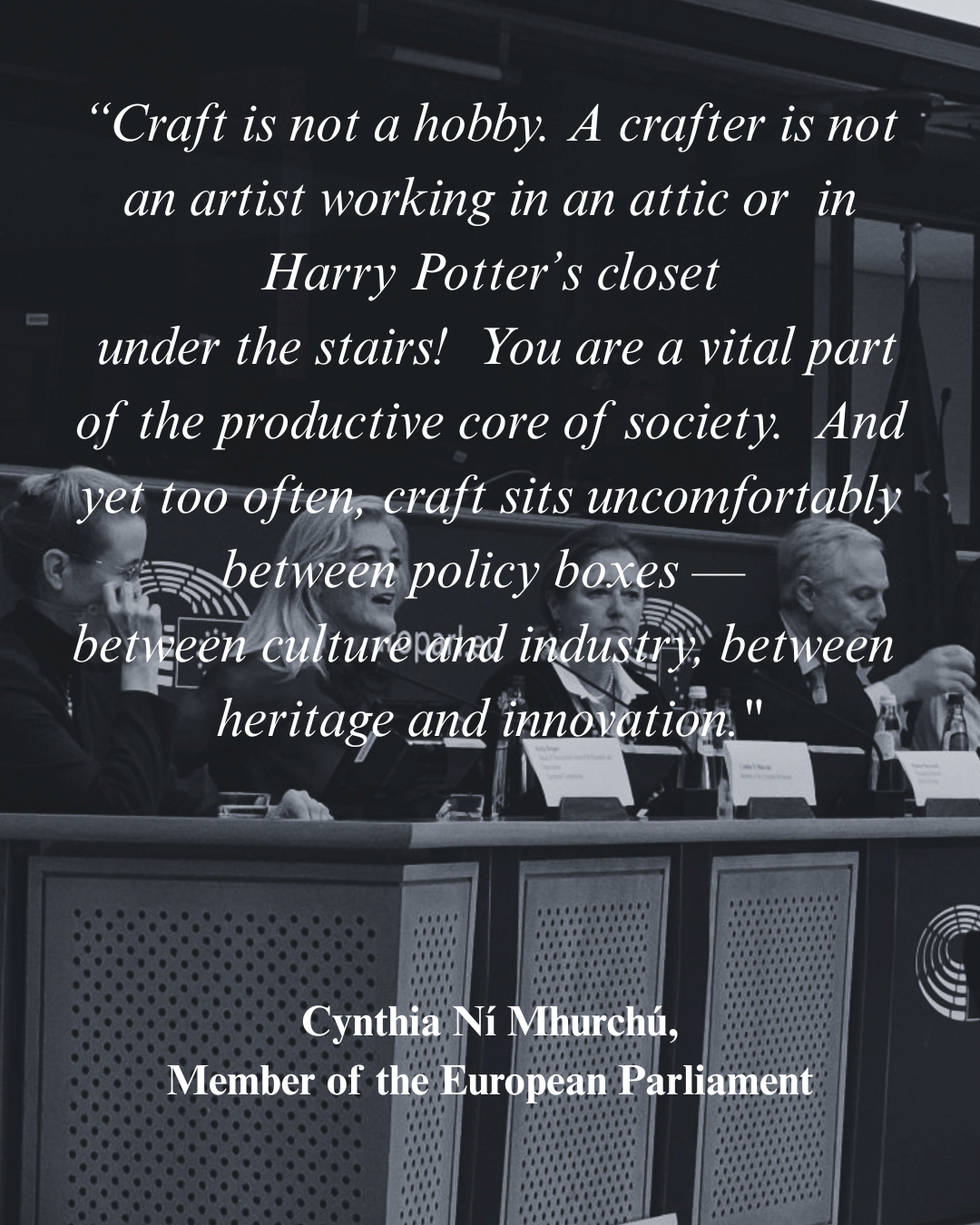 Following the CRAFTOUR General Conference, a podcast interview was recorded with Cynthia Ní Mhurchú, Member of the European Parliament, focusing on the realities, challenges and future of the crafts sector in Europe. The discussion featured invited speakers from the CRAFTOUR General Conference, including Madina Benvenuti – coordinator of the CRAFTOUR Initiative and Managing Director of Mad’in Europe, Audrey Aubard – Secretary General of FFIGIA and Hugh Roche Kelly – Independent Woodturner and Head of Workshop at Sonian Brussels. The interview was conducted and moderated by Emily Keane, whose questions helped deepen the conversation on the role of crafts within European frameworks, ranging from competitiveness and the green transition to innovation and heritage.